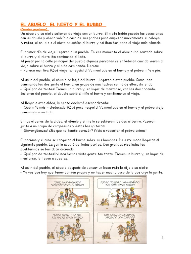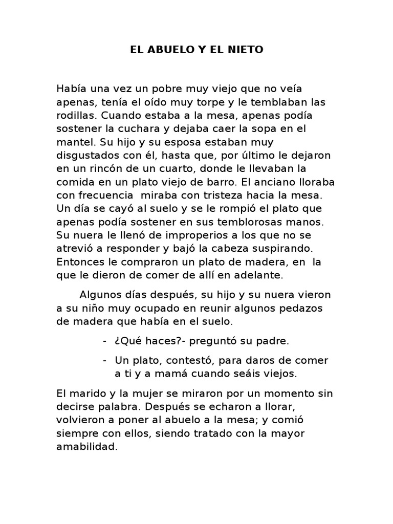 El abuelo y el nieto. Hijo y su mismo hijo estaban muy disgustados con él hasta que por último le dejaron en un rincón de un cuarto donde le llevaban su escasa comida en un plato viejo de barro. El primer día de viaje llegaron a un pueblo en ese momento el abuelo iba sentado sobre el burro y el nieto iba caminando al lado. La mujer de su hijo y su mismo hijo estaban muy disgustados con él hasta que por.