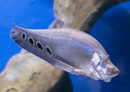 Baby clown knife fish. Very distinct flat silvery fish with long anal fin that gives the knifefish its common name. Young Clown Knife fish will school around structure. The Clown Knifefish is from Asia.